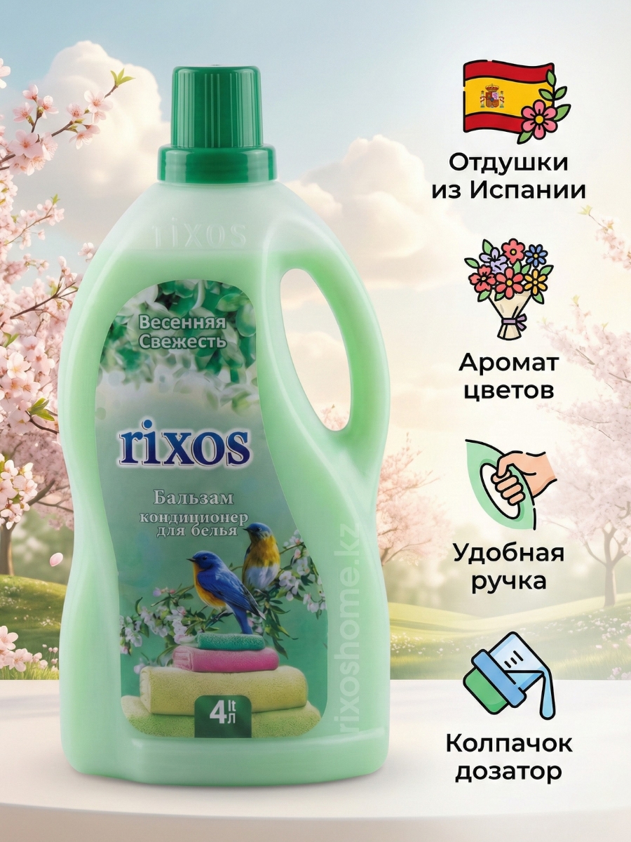 Кондиционер-ополаскиватель rixos - это: аромат весенней свежести, в который влюбляешься. Мы используем настоящие испанские отдушки, чтобы ваше белье благоухало свежестью, а не «химией».